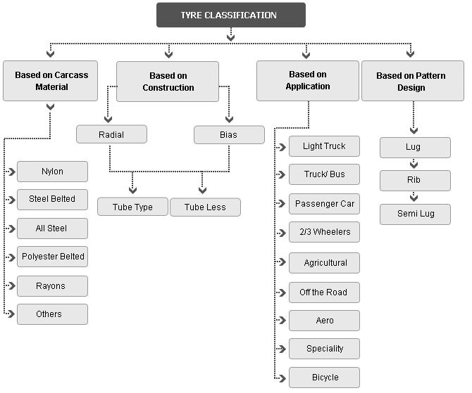Chúng có thể được phân loại thành lốp radial, lốp thiên vị, lốp lai xuyên tâm, lốp hoàn toàn bằng thép, lốp gia cố bằng sợi và lốp khí nén. Loại lốp được sử dụng phổ biến trên ô tô du lịch hàng ngày là lốp radial.